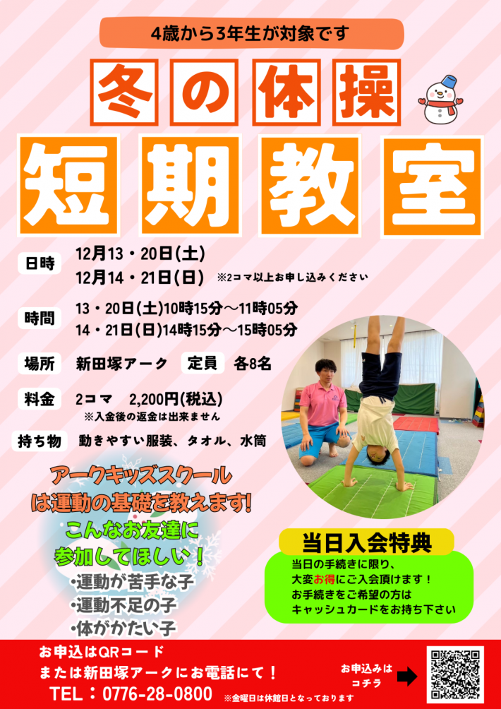 そこで、短期教室を実施致します! マット運動・跳び箱・鉄棒を中心にお子様がワクワクするような運動を沢山行います。️