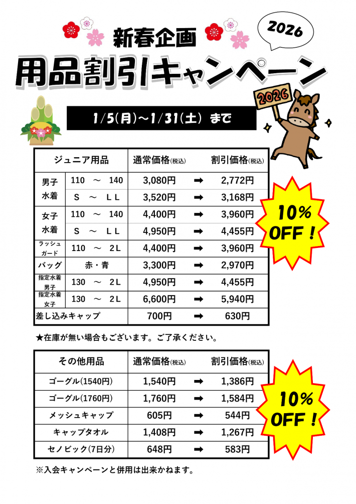 1月は新田塚スイミングスクール全施設にて用品セールを開催!!