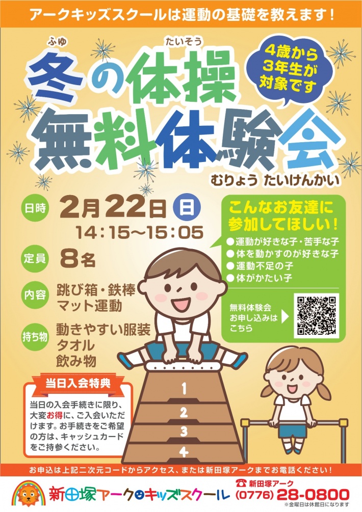 そこで、2月に体験会を実施致します。 マット運動・跳び箱・鉄棒を中心にお子様がワクワクするような運動を沢山行います️